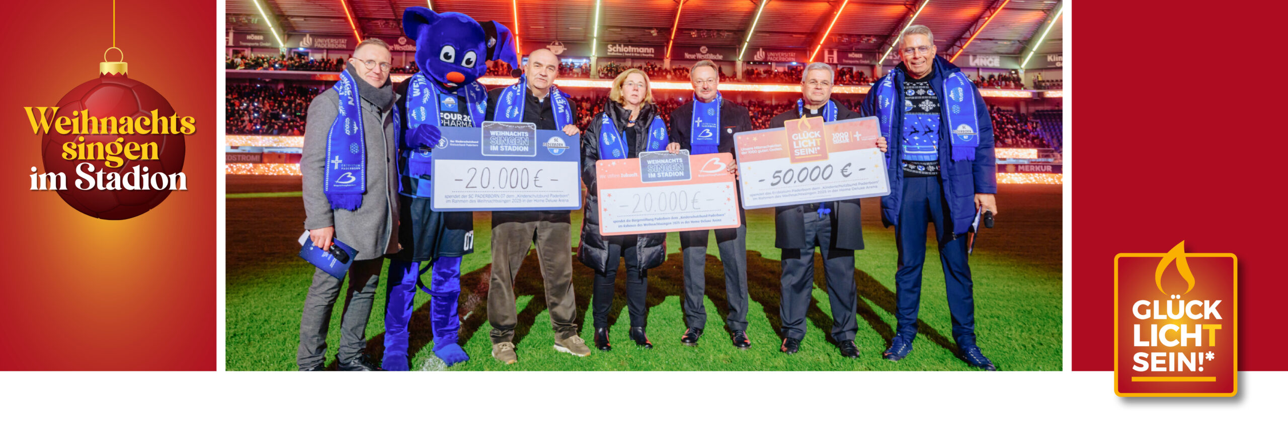 Am 14. Dezember folgt beim Weihnachtssingen in der Home Deluxe Arena noch ein besonderer GLÜCKLICH/T-Moment: Gemeinsam mit dem SCP07 und der Bürgerstiftung Paderborn wird Erzbischof Dr. Udo Markus Bentz Spenden an den Kinderschutzbund Paderborn übergeben.